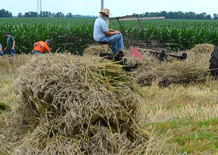This small 10 acres maybe? field took us the better part of the day to harvest and even then it wasn’t complete, because the bundles had to dry, then be placed on a wagon where they were taken to our local steam engine grounds for a demonstration during the Pioneer Steam Engine Show and the wheat was separated from the plant. We also had many hands to help! Today we are able to harvest a large amount in one day with a lot less man power.